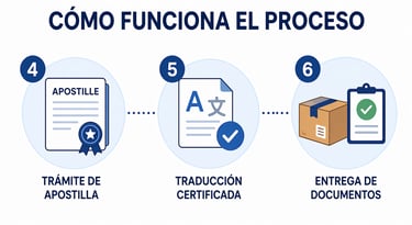 Después del pago, preparo el documento y realizo el proceso de apostilla según el estado y el tipo de trámite.Traducción certificada, si hace falta